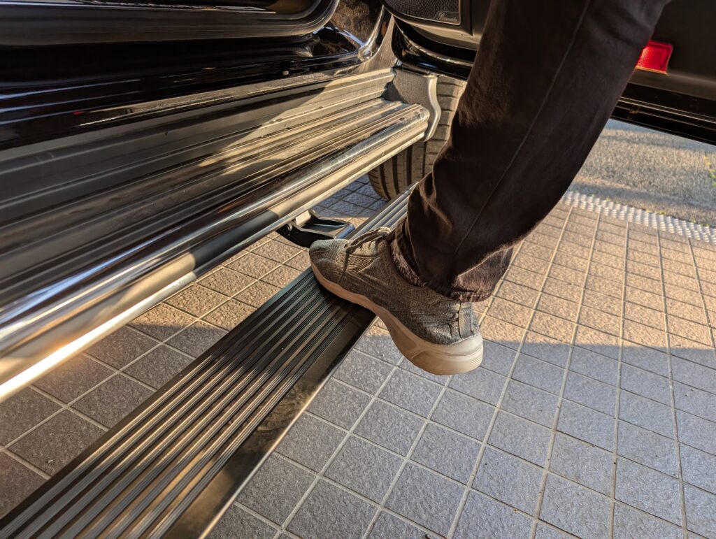 ドアを開けると足をかけるのに丁度いい高さまでステップが出てきます。右のドアを開ければ右のステップが出てきて、左のドアを開ければ左のステップが出てきます。電動サイドステップに足をかければ純正のステップには足をかけなくてもラクラク乗り降り出来る感じです♫