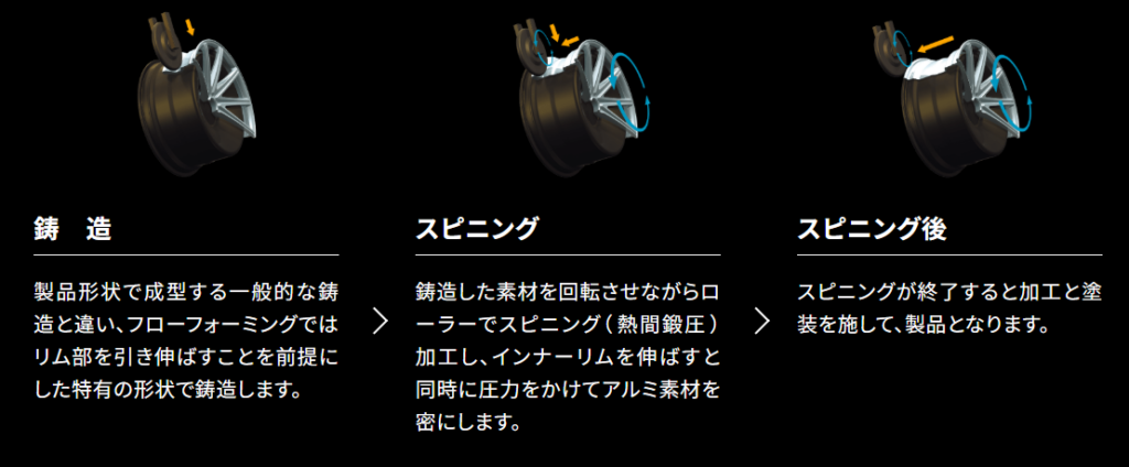 フローフォーミング製法: フローフォーミングは鋳造と鍛造のメリットを併せ持つ製法です。フローフォーミングではまずディスク面とリム部分を鋳造。リム部分に圧力をかけながらスピニング加工を施して必要最低限の薄さまで引き延ばします。その結果、アルミ素材の密度が上がり、鍛造ホイールに迫る鍛流線(メタルフロー)を実現。ディスク面は鋳造成型なのでデザインの自由度を確保。高い「強度」「剛性」「軽量」「デザイン性」を兼ね備えたホイールを作ることが可能な製法。