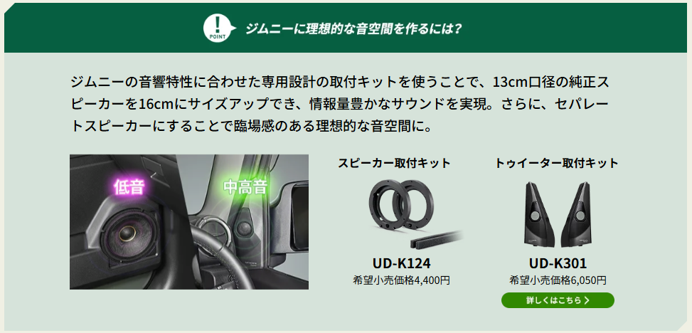 ジムニー専用に設計されたカロッツェリア取付キットなら、純正スピーカーからのサイズアップやセパレートスピーカー化も可能。