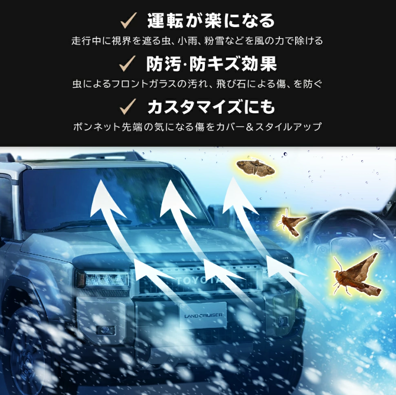 つまり、フロントガラスの前に「空気の壁」を作り出し、虫や小石をルーフの上へと流してしまう、という優れモノ!