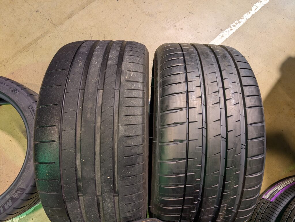 ↑左側、すり減った純正ピレリで、右側が新品のMICHELINです。