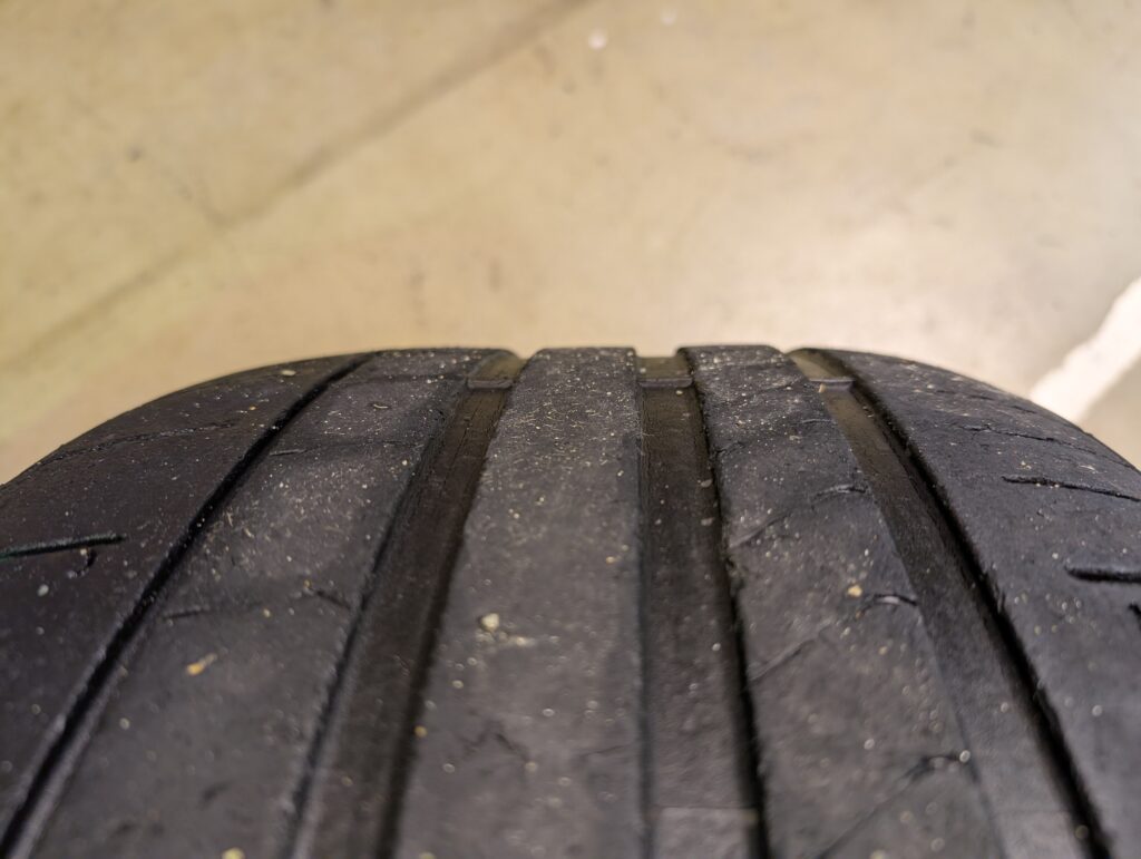 ↑ここまでタイヤのミゾが減ると安心して雨の日にアクセルを踏み込めないですね~。