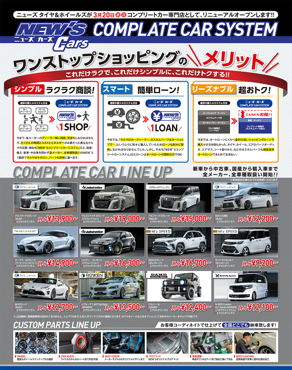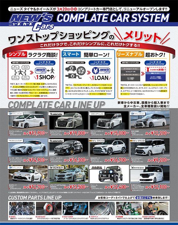 NEW'S CARSでは、安心安全なカスタムCARを、より、リーズナブルでお楽しみ頂けますよう、 新車をベースにエアロ、タイヤ、ホイール、足回り…etcパーツを厳選し、オリジナルコンプリートカーを製作致します!! しかも、スペシャル価格でのご提供となります。もちろん、新車渡しですので、日本全国どちらへ納車してもメーカー保証がついております。 尚、お客様のリクエストにより、グレード、パーツの変更、追加等は随時承っております。ご遠慮なくお申しつけください。