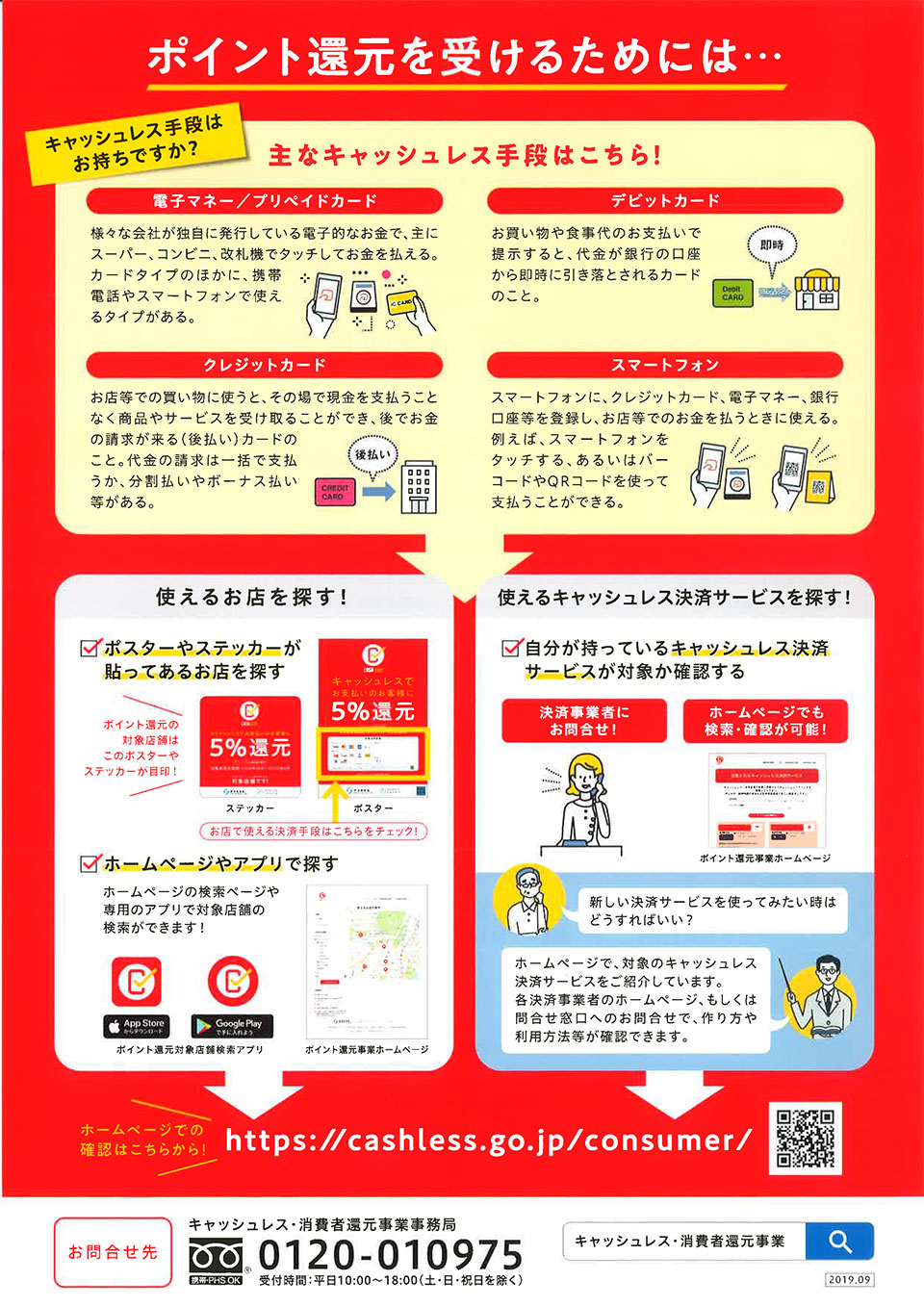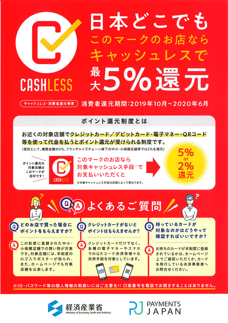 消費税UPに伴い【キャッシュレス・消費者還元事業】に登録されました。
