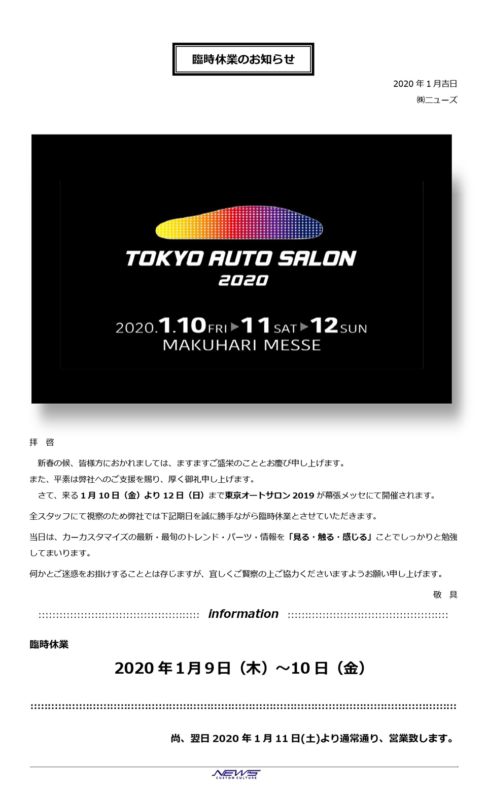 2020年1月9日〜10日は「東京オートサロン2020」視察の為、臨時休業させて頂きます。