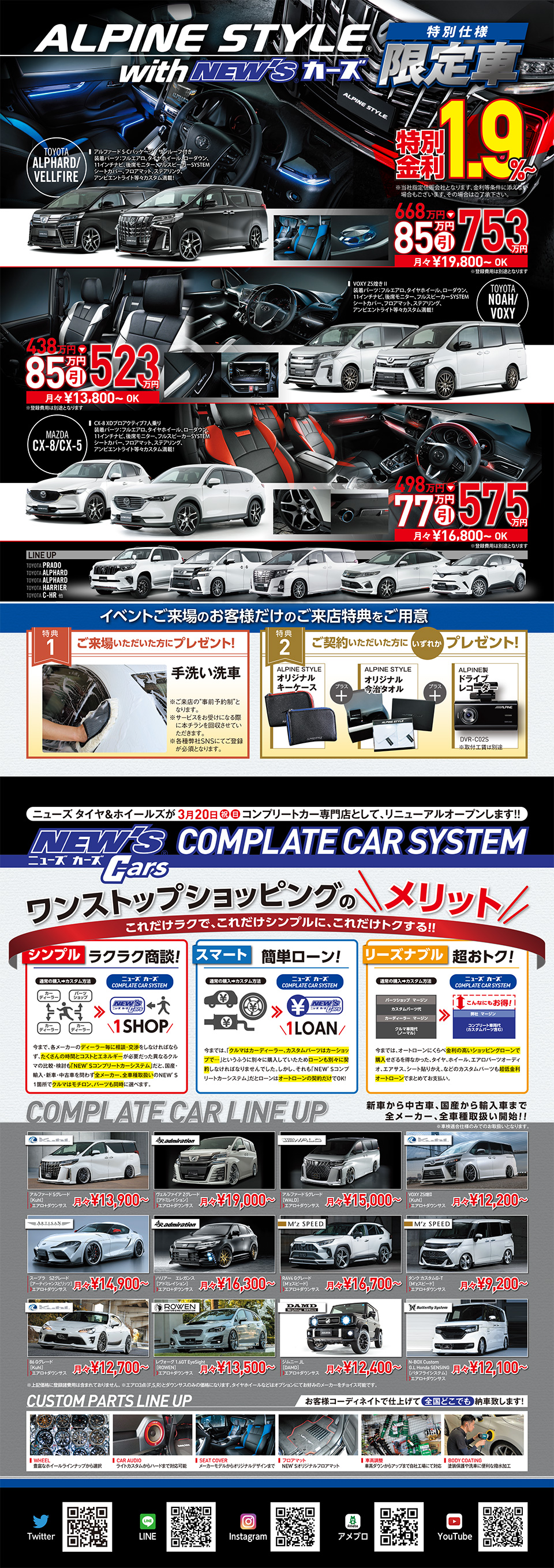 3月20日(金)〜22日(日)の3日間「イオンモール福岡」にて「ALPINE STYLE with NEW'Sカーズ特別仕様限定車 発表商談会」詳細発表!