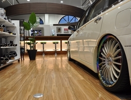 | 玄関を入ってすぐに並ぶホイールは旬なものを取り揃えています。大径なホイールやK−CAR用を揃えています。 |