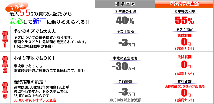 Fシステムでは買取保証金額をサポートするために、各種査定優遇特典(キズ、走行距離、事故修復歴)を全車種に適用していますので、安心して乗ることができます。