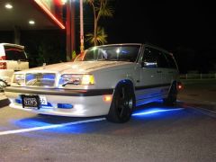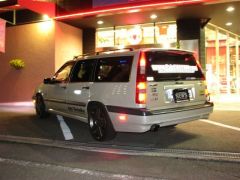 昼間は一見ステッカーカスタムのみに見えるこのボルボ。夜になるとまた違う顔を見せてくれます。全身を包み込むブルーのLEDたちは圧巻!!(わかりやすいように、少し暗めの画像も掲載しています)ポイントでフロントとリアに埋め込んだサイドマーカーは10ハリアーUS純正をチョイス。ウィンカーのオレンジと重なりまとまったポイントになってるでしょ?