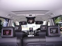 まずドアを開けるとステップにはアルファードロゴのLEDイルミが装着されて!ステアリングはシルクブレイズのガングリップ付き!そして元々Kさんには設定の無いステアリングスイッチも装備!そしてセキュリティには Grg/ZXV/V!オーディオはカロッテェリアのメインユニットに、アルパインのフリップダウン・ヘッドレストモニターを入れた、ツボを抑えたナイスカスタムです。サンバイザーモニターとセカンドシートにヘッドレストモニターを4つ投入して合計8モニターになりました(-^∇^-)お子さんもやさしい!さすがのパパさんですね!!これで取り合いになりませんね!えらい!