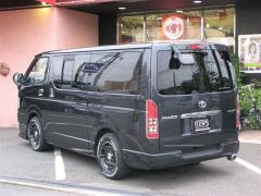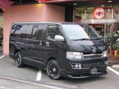 お仕事車&自家用車として活躍されている 現行ハイエ−スです。 ナスカ−仕様のタイヤにボディカラ−に良く似合ったブラック&ポリッシュのデイトナホイ−ルもいい感じです、これで現場に乗り入れてるんですからそれもカッコイイです。