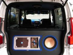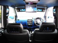 あらゆる所にモニターを埋め込み総勢14台のモニター。リアもAMP・ウーファーを埋め込み見せる仕様にしています。ダッシュボードをはじめ、所々に入れているブルーが内装のポイントになっています。