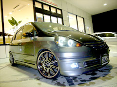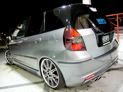 最近多いツートンですが、今回のFitはあえて天井部分のみブラックペイントしボンネットはカーボンボンネットへ変更! ポイントでピンストにてレッドのラインを入れました!!macのフルKitを装着しフロントバンパーリップ加工と塗り分けペイント、サイドステップにもダクトを追加&モールなどにカーボンシート針☆ ホイールもブラックペイントを追加し、差し色にREDでピンストいれてます。テールはWALDのテールをワンオフで左右出しに。極めつけは、今流行りのイカリングをナントダブル装着! さらにFOGにもイカリングIN!! 顔にインパクトを出し、益々完成度上がっちゃいました!!