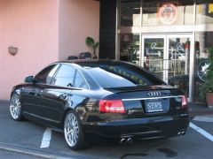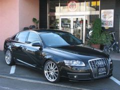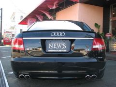 現行のA6アウディカスタムです!19インチにH&RのエアサスコントローラーにてギリギリまLOWDOWNできめてます。まずフロントグリルはS6用に交換し、さりげないアイラインでナイスな面構えになってます、リアのマフラーがワンオフ加工にて左右4本出し仕様へ変更。トランクスポイラーもさりげない程度でトータルバランス重視な大人カスタムですね。