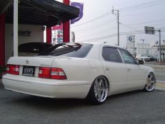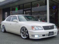 WORK LS406でベタッと車高を落として一見シンプル仕様の20セルシオです。しか-しポイントはヘッドライトです!!Lo側にフーガプロジェクターを入れて4灯プロジェクタ−&イカリングでカナリ目立ちます☆まだ若いオ−ナ−さんなので今後が注目の一台ですね♪