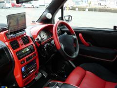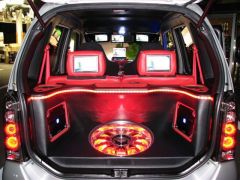 赤と黒に徹底的にこだわって作り上げた空間!!オーディオもこだわってNEW’Sデモカー風使用に1番のポイントはホイールを埋めたその下にブレーキのローター風にアリアンテのSUBを埋め込んだところお客様の一番のお気に入りです。