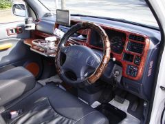 中は純正では寂しいので、ウッドパネルをメーター周りやウインドウパネル、フロントテーブルなど随所に取り入れ、黒のシートカバーで室内も落ち着いた雰囲気に整っています(^^)オーディオはヘッドユニットにカロッツェリアのサイバーナビなので、TV・CD・DVD・HDDなどドライブにはかかせません(≧−≦)b
