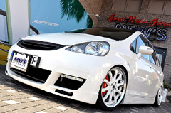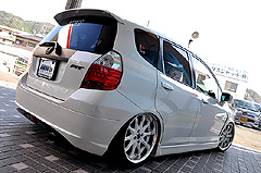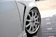 まず目に入るのはエアロですね★どこのエアロかってことなのですが。。。そう特注のワンオフエアロです!BMWの1シリーズエアロを加工して付けています。ステキでしょ!フェンダーダクトとワークのホワイト塗装のホイルもマッチして気品を感じますね!足回りはBOLDのエアサスです!