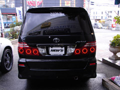 アルファードの限定グレードをベースに渋く作り上げているK様。19インチWORK LS207 ニューズオリジナルカラー コージーブラックを装着しTEINの車高調とEDFC(遠隔減衰力調整マシーン!)を装着し乗り心地バツグン!! 今回テールレンズを変更☆ワンオフにて制作!アルファードのリヤ部分を引きしめてくれますね(^−^)