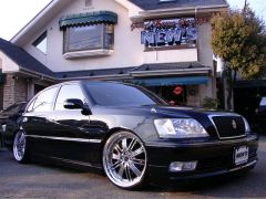 エアロはWALDのエグゼクティブラインをチョイスしリヤには汎用マーカー+ダクトをワンオフで入れてます! ホイールにはWORKのヴァリアンツァのF2S 20インチを車高調で低車高走行! ヘッドライトの下部分ウインカーはオーナーO君こだわりでワンオフLED加工! 仕上げはオールペンブラック! イ・カ・ツ・イ!!