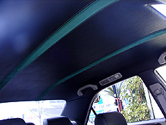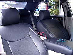 純正ナビから、アルパインX077に変更し、ブラックのシートカバーを装着(*^^)vブラックを基調に天井、ピラー、ドアを張替え、フロアマットもワンオフにて制作し、ワンポイントで大好きなカラーのグリーンをうまく使っています☆