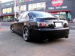 進化が止まらない、S様!エイムゲインをフルキット装着し、リヤは、ブラッククロームのマフラーカッターを溶接にて装着し、ヘッドライトも3連プロジェクター&イカリング仕様でフェイスの印象がガラリと変わりました(^−^)ホイールはレオンハルト、ラーゼンマットブラックポリッシュ19インチにタナベの車高調でバッチリかためました(*^^)v