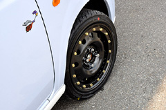 純正のスチールホイールをベースにカスタムしちゃいました(^^)鉄チンとはいえ全く馬鹿に出来ない仕上がりになりましたね!!今後の仕上がりも楽しみな一台です!