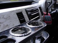 今現在、トランク作りこみ真っ最中ですがウーハーアンプをLEDで飾っています、仕上げは4枚モニター仕様で5.1chシアターシステムになっています。白大理石でイージーグラフィックスを各部追加しました!天井、ドア等もアルカンターラで張り替えて純正の部分はすべてブラックに塗装しましたのでバリ渋いですね(-^∇^-)