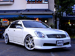 足元には、WORKグノーシス20intのブラッシュドを装着し、F9J、R10Jをチョイスです(^^♪キャリパーもV36クーペを流用し前後ともビッグキャリパーに変更です!エンブレム類は、インフィニティ仕様で統一し、足廻りは乗り心地を最優先で考えRSRをチョイスしています☆