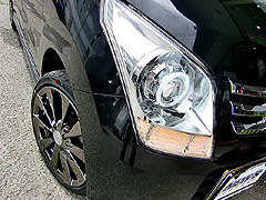 16インチジェノーマ☆ボディーカラーに合わせてブラッククロームコーティングをチョイスしました!!それと、一番のポイントは、、、ヘッドライト!プロジェクターキット&LEDウインカー!!このインパクトは絶大です。(^^)