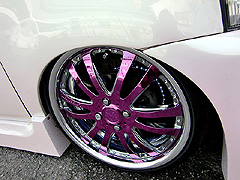 外装はマジョーラのピンクでオールペイント!ホイールは新作 レーベンハートLG−1 17インチ☆足回りはACCエアサスからBOLDエアサスに変更!!ブラケット加工&J−LINEリアアクスルで激低車高になってます!ホイールディスク面にはキャンディーマゼンダでペイントを施して、ボディーカラーとのバランスをとられていますね。