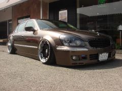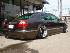 BOLDエアサスにトラフィックスターDTX20インチをインサート☆完璧な足廻りですねっ♪最新仕様はアーチ切り上げのオーバーフェンダー作成です(^^)同時にBMW M5純正色のセパンブロンズメタリックにオールペイント&ホイールを日産純正ブラックに艶々ペイントしました☆