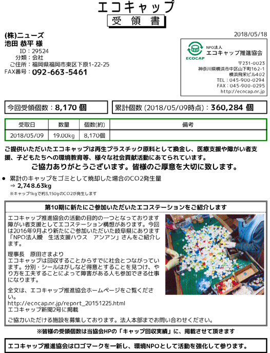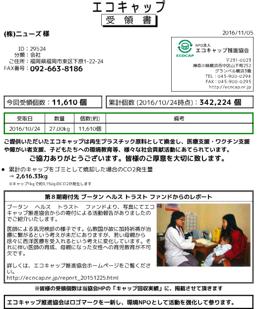 世界では一日に6000人もの子供たちが、ワクチンが手に入れられずに命を落としていて、それをペットボトルのキャップ回収で 役に立てようと言うことでNEW'Sでは全店・全員がエコキャップ集めをスタートします。ムダ捨てやゴミにはしません