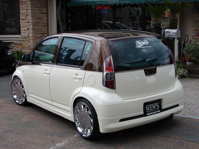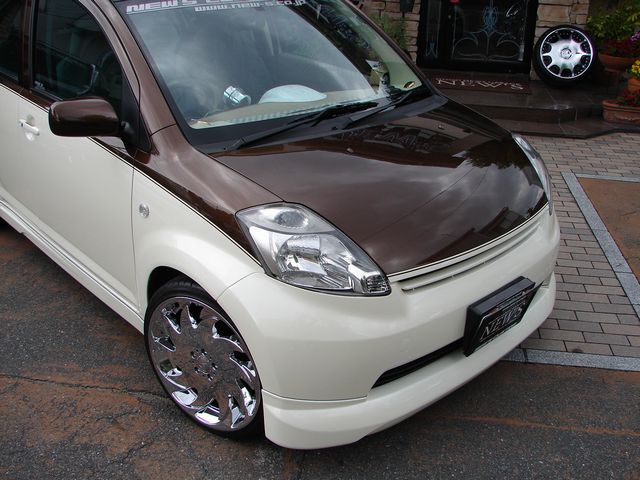 ニューズベージュに全塗装して、その上からニューズブラウンにツートーンペイントしています、塗料はシッケンズを使いツルツルのツヤツヤ仕上げです。トドメはタナベの車高調にリーディングエッジの18インチ、レガシィサイズの100/5Hを変換して100/4Hのパッソに装着しています、その際もちろんですがナチュラルにフェンダー加工しています。