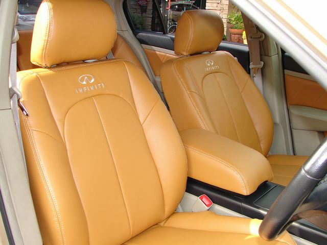 インテリアはもちろんレザーで色をあわせて張替えをしインフィニティの刺繍をあしらっています。もちろんモニターは9枚装備しナイトシーンでもばっちりです。
