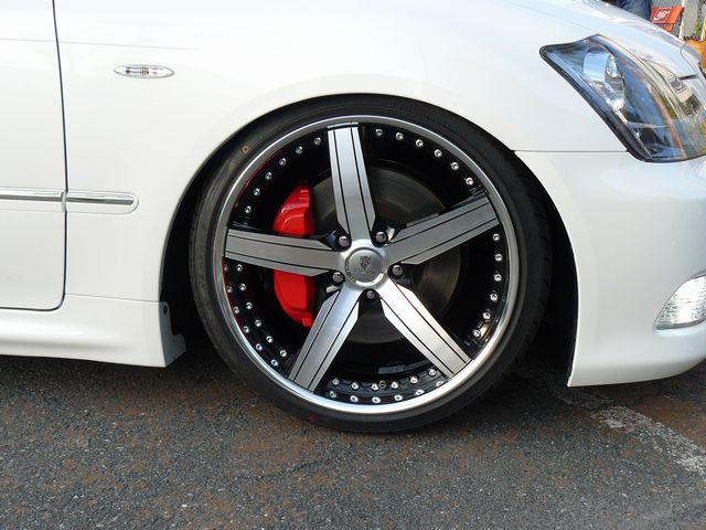 言えることはただ一つ…カッコイイ!!足元には、ニューズ筑豊営業部長T・Uさんのセンス光るナイスーコーディネイト!さすがです!最近ニューズ内では通な方が選ぶと言われているトラフィックスター STR!ブラックポリッシュを投入!!さらにリム・スポーク部と赤いペイントキャリパーを際立たせるためにインナーリムブラックを選択!そして足回りは今までBOLDのアブソリュートDSだったものを同メーカーのパルファムカップへとグレードアップ!!しかも絶妙でナイスな車高!さらにリアマフラーにはあの高級車 LSのディフューザーをワンオフ取り付け!これは苦労しましたよ、何せ純正バンパーにつけたので樹脂加工でしたから(><)トドメにLSアンテナを配線加工してビルトイン!う〜ん何度見てもイイっすねぇ〜(><) |