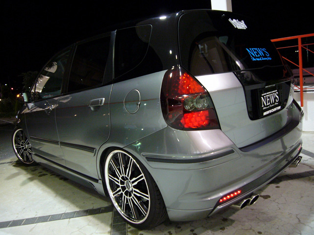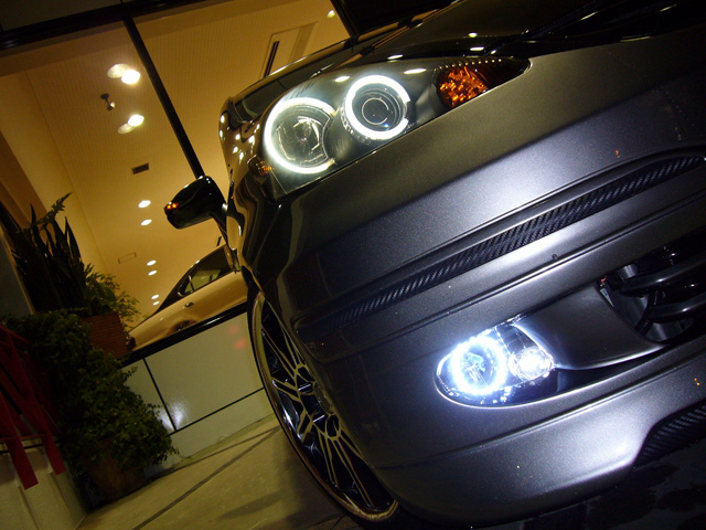 最近多いツートンですが、今回のFitはあえて天井部分のみブラックペイントしボンネットはカーボンボンネットへ変更! ポイントでピンストにてレッドのラインを入れました!!macのフルKitを装着しフロントバンパーリップ加工と塗り分けペイント、サイドステップにもダクトを追加&モールなどにカーボンシート針☆ ホイールもブラックペイントを追加し、差し色にREDでピンストいれてます。テールはWALDのテールをワンオフで左右出しに。極めつけは、今流行りのイカリングをナントダブル装着! さらにFOGにもイカリングIN!! 顔にインパクトを出し、益々完成度上がっちゃいました!! |