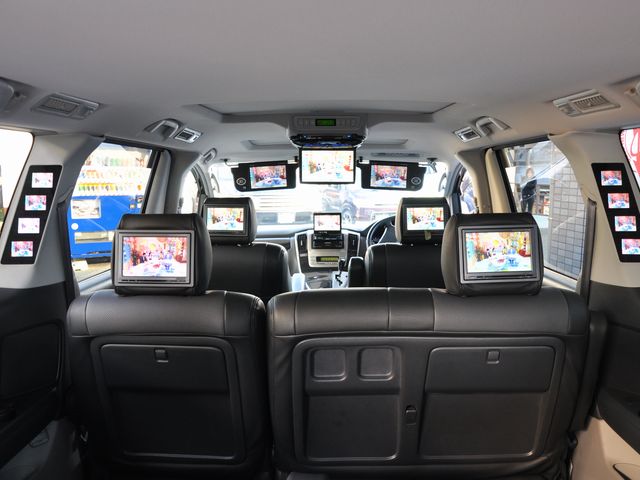 子供が喜ぶ8モニター仕様です、内装のレザーも黒で統一していてコレまた渋いです(^^)しかしフロントがJPのリップでリアとのバランスが?なので次回ここですね!Mr・Y様宜しくお願いいたします、また一緒に考えましょう(^-^)VCピラーの左右にミニモニターを8個追加して合計16モニターを完成させました(^-^)V 大迫力ですね! |