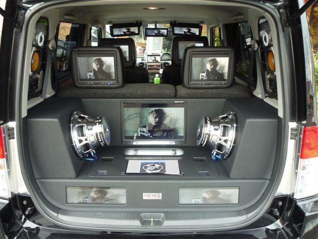 メインユニット・ミラー・バイザー・ヘッドレスト・トランクと室内には計12枚のモニター!なかなかの迫力!トランクにはライトニングのサブウーハーとアンプを作りこみでイイ感じにインストール!ここまで仕上げるのに時間はそんなにかかってません…!しかし!次なる内装プランもすでに準備中とか…Σ(´Д`;)ナニ?! こうご期待です!!(^ ^;)ノ |