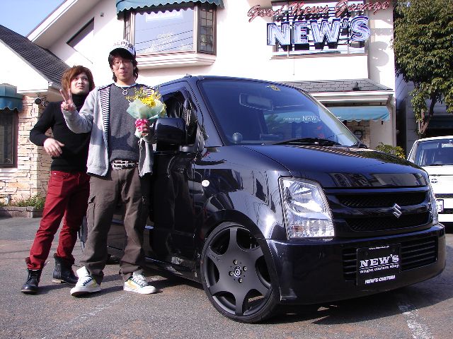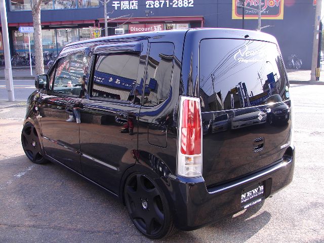 今回のワゴンRが履いてるマットブラックホイールはみなさんご存知「クレンツェ バズレイア」と!ラグなK-carで有名な「KLC」のダブルネームコラボにより登場した。「KLC 689 MONO」!!黒ボディでも単調にならず、ひっそりとした中にも、際立つ存在感!さらに極低車高を実現させるために足回りにはBOLDのレボUを装着!ヘッドライトにはHIDも入ってます!これからが楽しみな1台です!! |