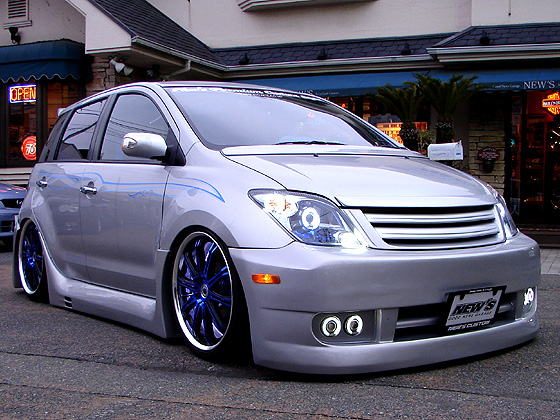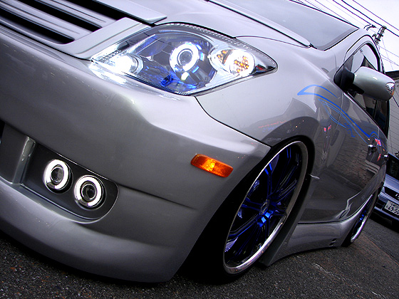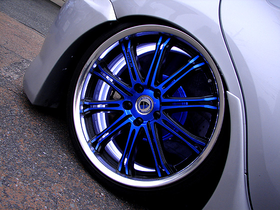 ファブレスのフルキットをベースにFOG加工、サイドとリヤにダクトを追加しています。ヘッドライトも加工でプロジェクターを入れ、スモール部分にはLEDプロジェクター投入で贅沢カスタムです(*^^)vホイールはシュバート19インチです。ディスクをキャンディブルーに側面は、ダークブルーパールでペイントしています!しかもBOLDエアサスです(^〜^)究極は、テールレンズをワンオフにてフルLED&流れるテール仕様で目立ち度抜群です☆ |