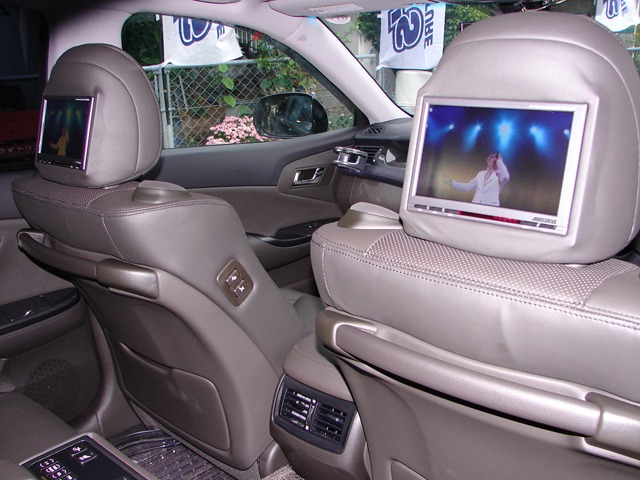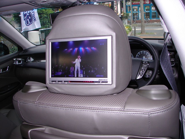 ドライブ走行中に後部座席に乗られる方やお子さんが退屈しないようにと純正ヘッドレストへアルパイン製の高画質モニターを埋め込んでいます。見やすくてイイ感じです☆