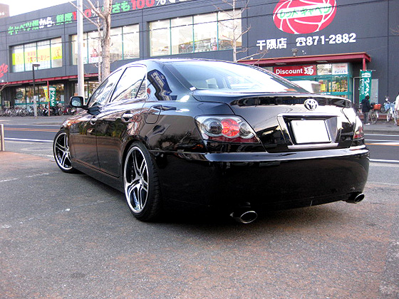 進化が止まらない、S様!エイムゲインをフルキット装着し、リヤは、ブラッククロームのマフラーカッターを溶接にて装着し、ヘッドライトも3連プロジェクター&イカリング仕様でフェイスの印象がガラリと変わりました(^−^)ホイールはレオンハルト、ラーゼンマットブラックポリッシュ19インチにタナベの車高調でバッチリかためました(*^^)v |