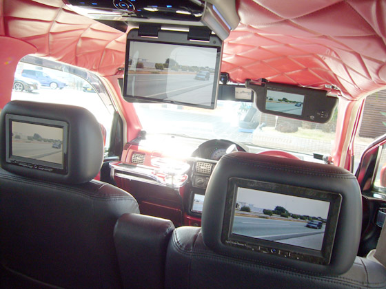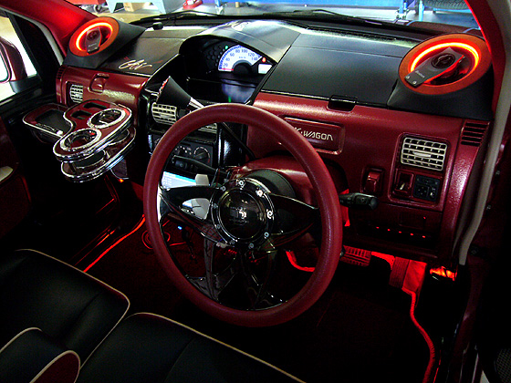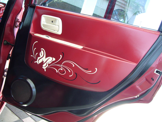 ドアを開けると・・・そこに広がるのはノーマルのekとはまるで別の車のような空間!! 今回ダッシュボードのスピーカーはアウターバッフル仕様にして紅いLEDの光も内装同色でキメてます!! そして全体的に張替え&ペイントで純正らしいところが残ってましぇん! さらにヘッドレストやバイザー・フリップダウンとモニターの数々・・・(汗 さらに! ドアにはワンポイントとして蝶を模したピンストも!!! Σ(゜Д゜ )ハッ と中も外も蝶〜インパクト抜群な一台です!!!! |