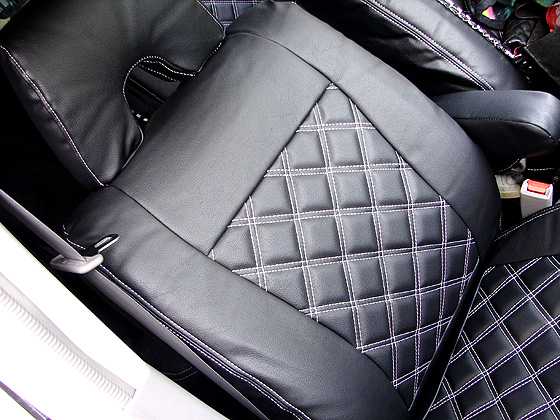 アルパインX077を取り付けし長距離ドライブもばっちりです(*^^) 今回、車内のイメージ一新の為、シートカバーを装着!セミオーダーでダイヤキルトのに変更しステッチも白に☆フロアマットも黒をメインに白のパイピング仕様です(^^♪ |