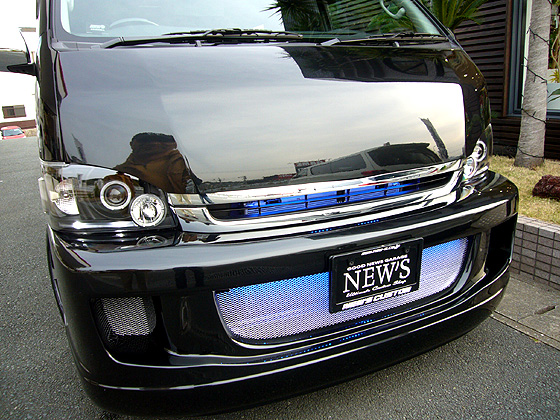 今や大人気の200系ハイエース!! 今回こちらのハイエースのエアロはGPO、レガンス、ドッグファイターとオーナー様お気に入りのメーカーをMIXさせてます! ヘッドライトはプロジェクターにイカリング!! さらにグリルをブルーのLEDでライトアップ☆でインパクト抜群!!! 足元にはESSEXの18インチにドッグファイターの足回りでナイスカスタムです!!!!(^∀^)b |