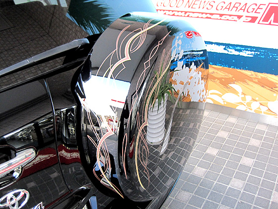 ブラックの艶々ボディーにレーベンハートLD1が映えてますね(^^)その奥にチラッと見えるキャリパーのGoldペイントもさりげないお洒落です♪背面タイヤのカバーにはピンストライプを入れて独特な雰囲気を醸し出しております☆