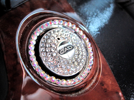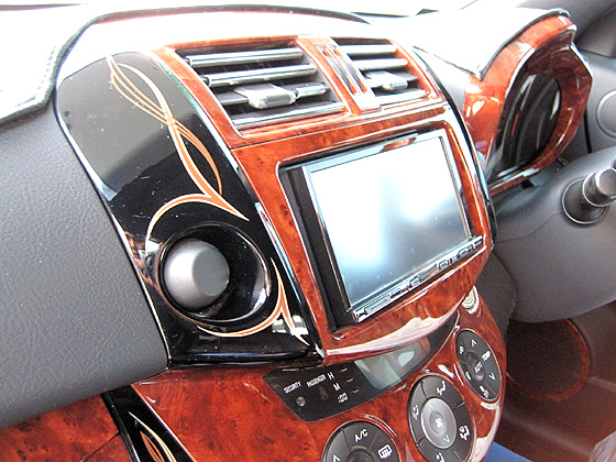 室内もシンプル仕様でブラックのシートカバーや高級感のあるウッドパネルを装着しています!外装にあわせてセンターパネルにもピンストを入れてるのがポイントですね(^^)/スタータースイッチにはDADのスワロフスキーカバーを装着して高級感アップです♪