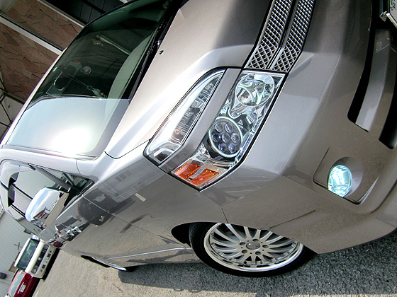 いきなりっ!!ヘッドライト加工からスタートをきられた、Tさま!!最近は定番化してきたヘッドライト加工ですが気合の入った一台が出来ました。F50シーマのバルカンを移植してもちろんCCFLリングも取り付け、ウインカー部分にはLEDテープでウインカーの縁に沿ったラインを作りました!HIDも装着して厳つさUPですね☆