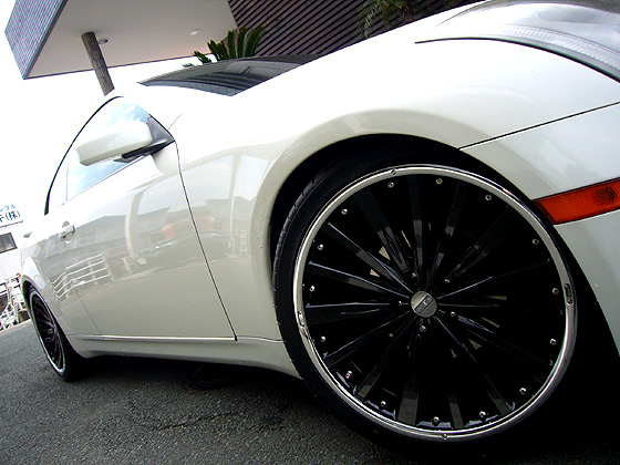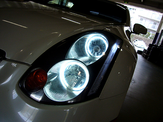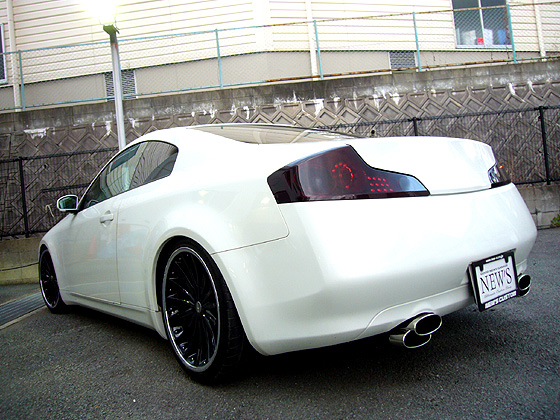 こちらのホワイトボデイのスカイライン、足元にブラックディスクのマーテル20インチを履き、テールもスモーク仕様とちょい悪感を出しつつヘッドライトにはCCFLのイカリングでオシャレにカスタム! マフラーはWALDのマフラーを使いながらIS-F風に仕上てみました☆